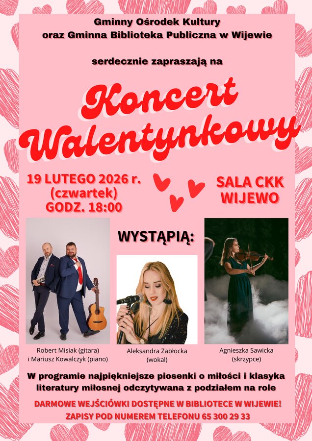 Gminny Ośrodek Kultury oraz Gminna Biblioteka Publiczna w Wijewie serdecznie zapraszają na wyjątkowy Koncert Walentynkowy, pełen muzyki, emocji i romantycznych nastrojów.