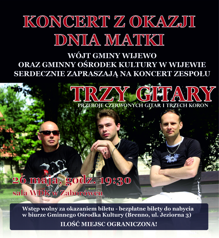 26 maja z okazji Dnia Matki Wójt Gminy Wijewo oraz Gminny Ośrodek Kultury w Wijewie serdecznie zapraszają na koncert Zespołu Trzy Gitary.