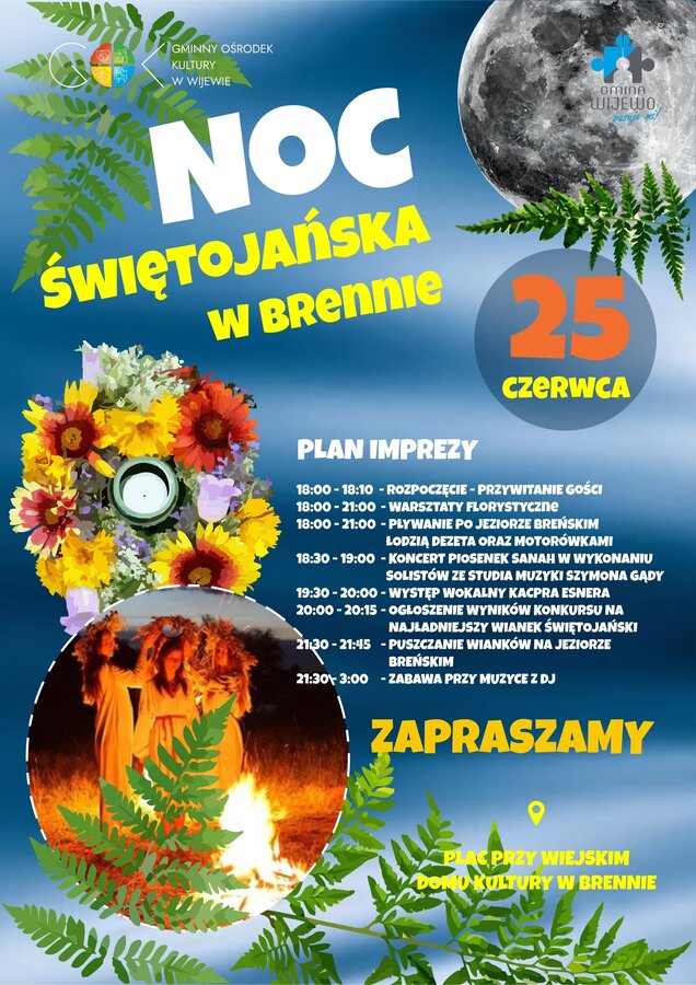 Noc Świętojańska w Brennie 09 czerwca 2022 Już 25 czerwca Noc Świętojańska przy jeziorze w Brennie, informacje na plakacie.