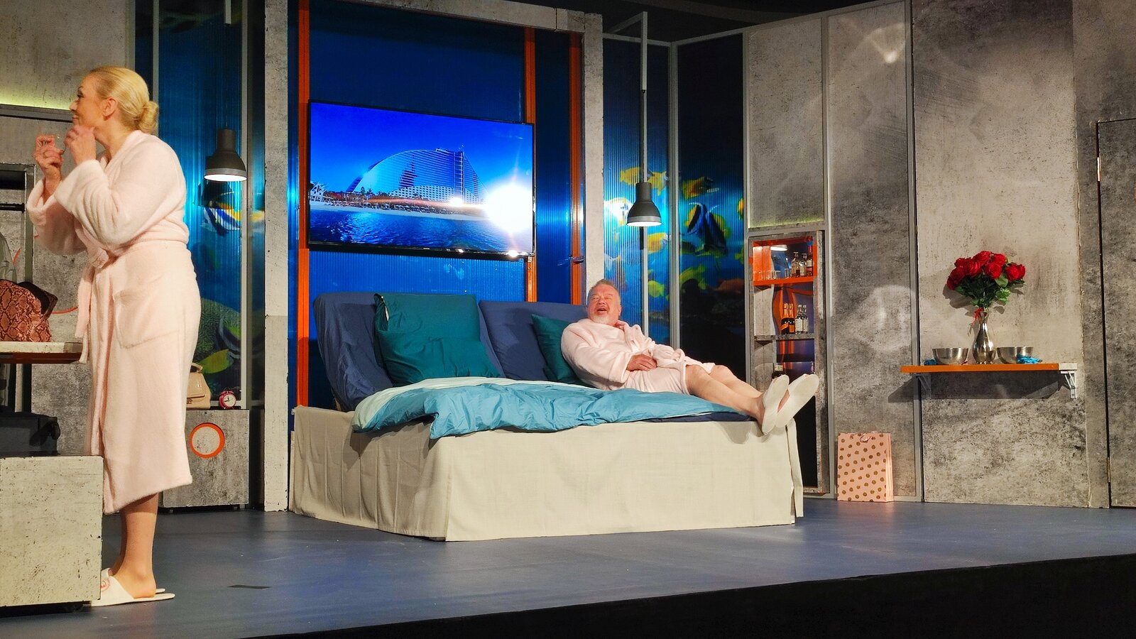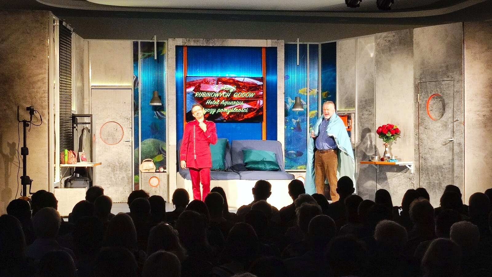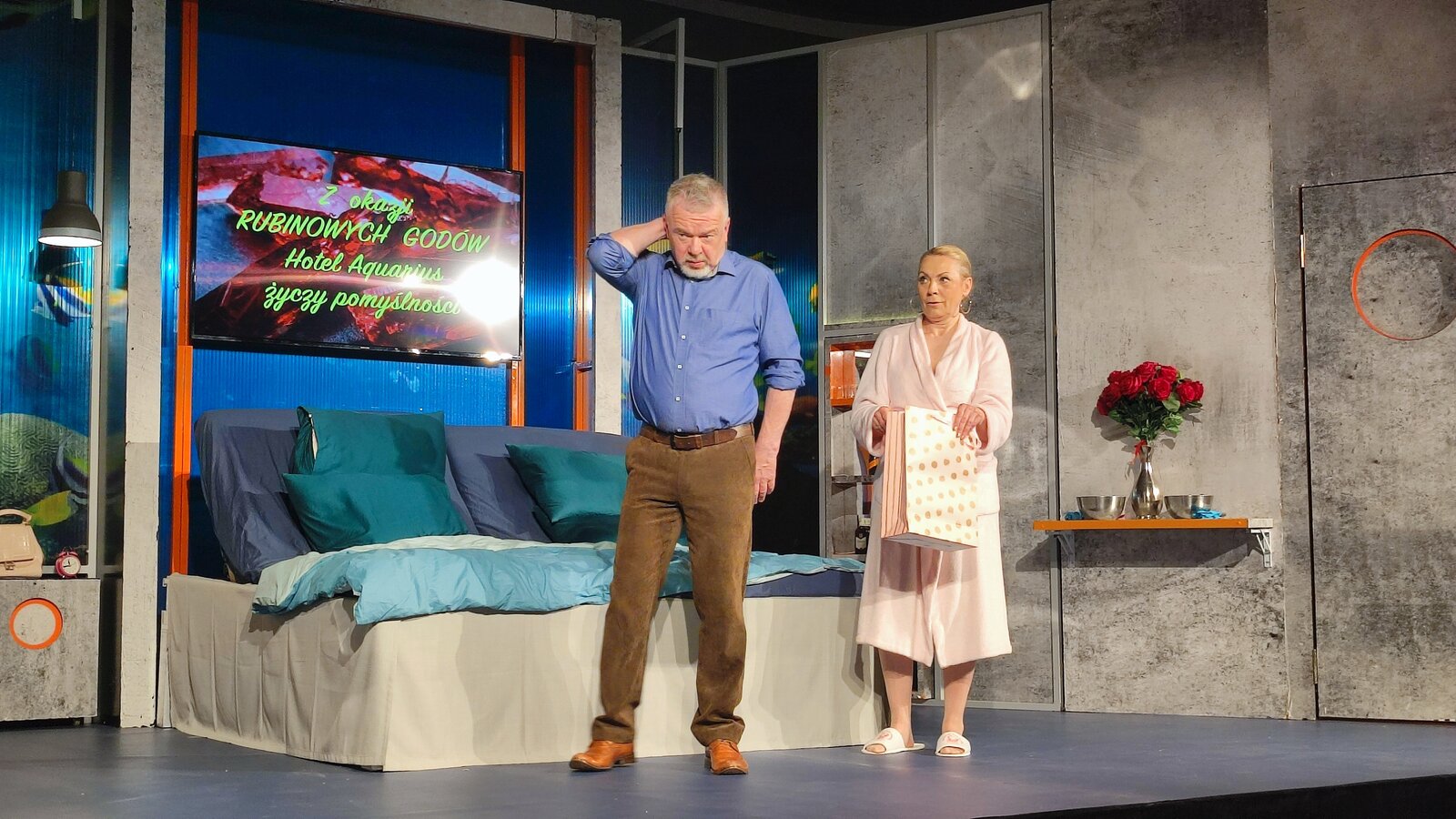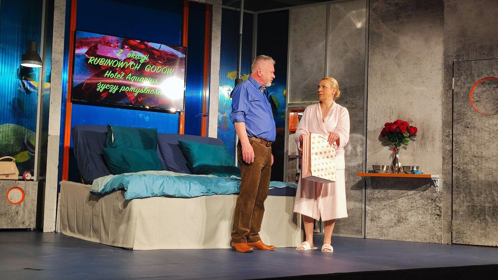 Teatr opowiadał o małżeństwie, o miłości, o zmieniającym się świecie … Grażyna i Marian obchodzący czterdziestą rocznicę ślubu, czyli rubinowe gody, otrzymali w prezencie od córki weekend w luksusowym hotelu. Nie byli w stanie zorientować się w super rozwiniętej technologii np. jak włączyć światło czy otworzyć drzwi. Ale nie tylko o miłość w sztuce chodziło - "Rubinowe Gody" to również kpiąca opowieść o polityce i politykach. Przedstawiciel tej klasy obawia się o swoją przyszłość. Jego pojawienie się było otwarciem kolejnej opowieści – o wartościach, jakie na co dzień spotykamy. Nie tylko w teatrze i nie w teatrze przede wszystkim.
